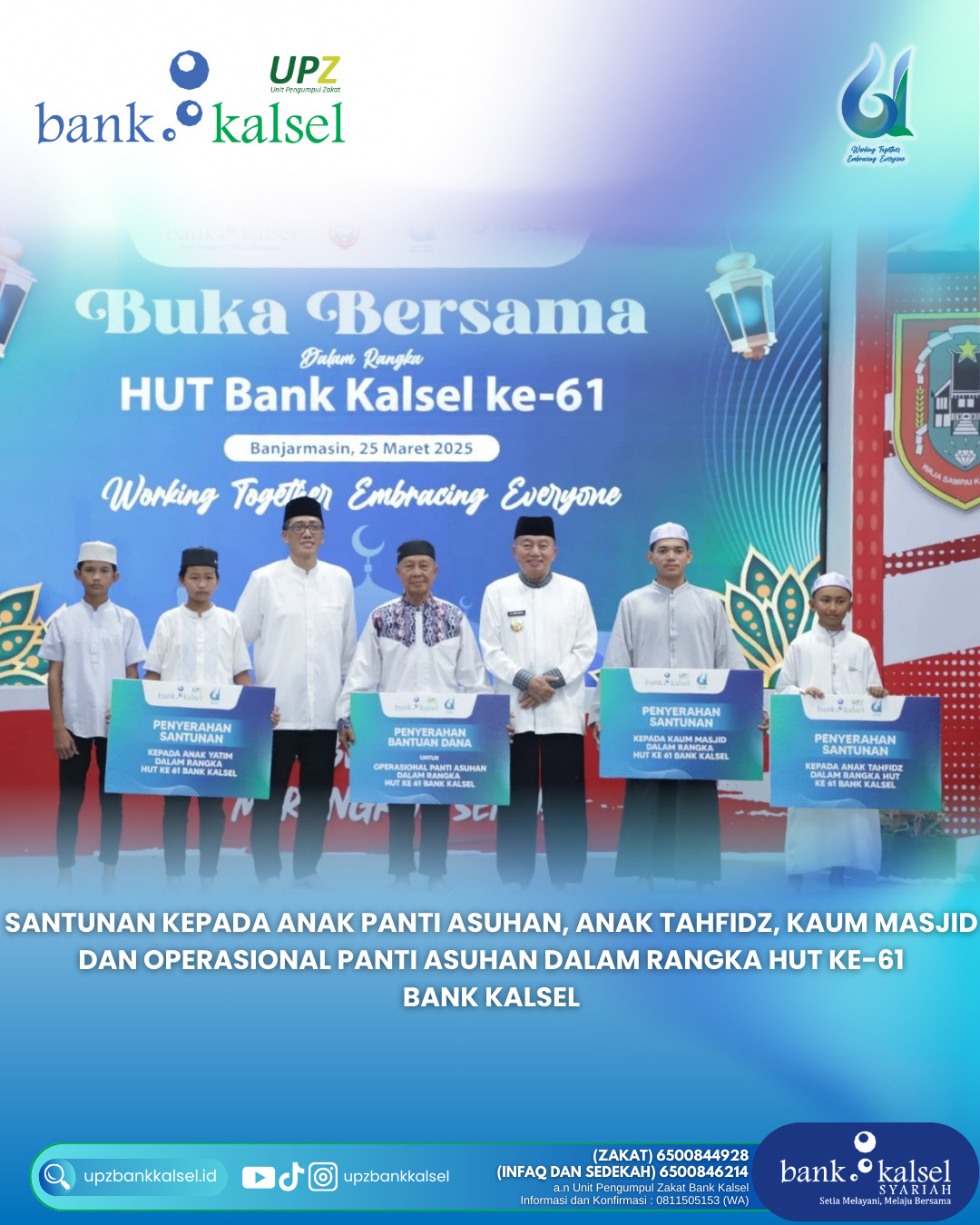 Dengan mensyukurinya HUT ke-61 Bank Kalsel melaksanakan kegiatan buka bersama, sholat hajat, serta pemberian santunan kepada Anak Panti Asuhan, Anak Tahfidz, Kaum Masjid dan Operasional Panti Asuhan.