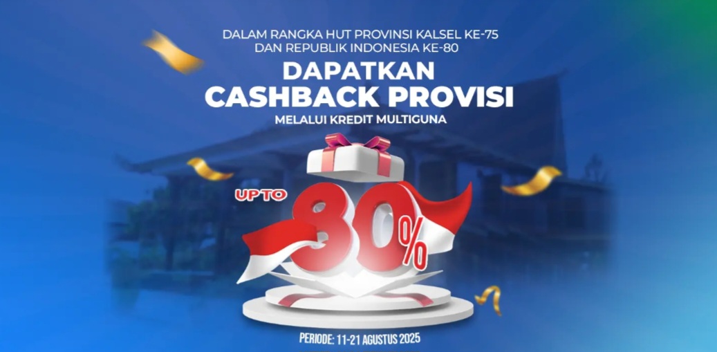BalainNews.com, BANJARMASIN – Momen spesial, promo spesial! Nikmati Cashback Provisi hingga 80% lewat produk Kredit Multiguna Bank Kalsel. Pinjaman jadi lebih ringan, rencana keuangan lebih lancar....
